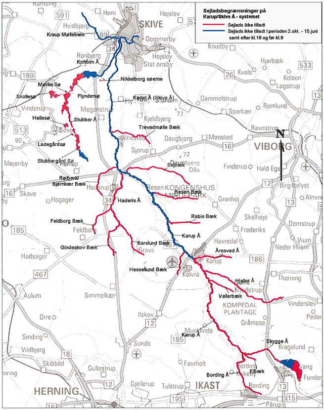 På Karup Å-systemet må der ikke sejles med motor, og kun i følgende bådtyper: kanoer, kajakker eller robåde. På Stubberupgård Sø må der kun sejles med både uden sejl.