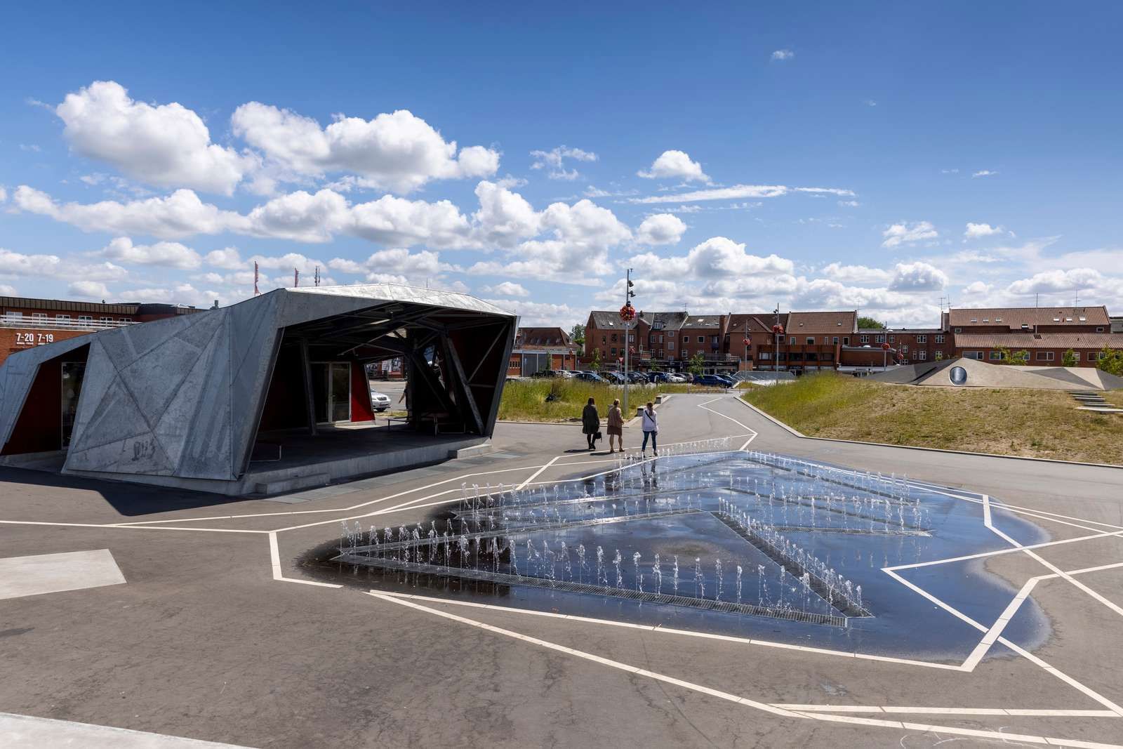 I den sydlige ende af Niels Due Jensens Plads, mellem skaterbanen, butikker og passager, er et område udlagt som gangareal.