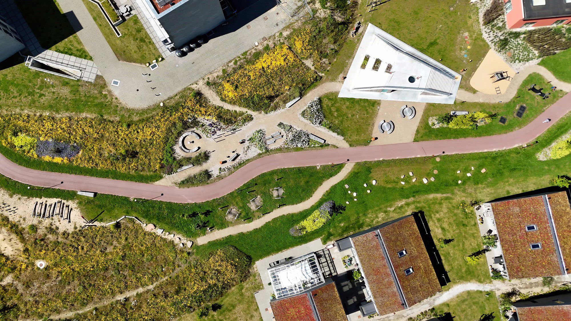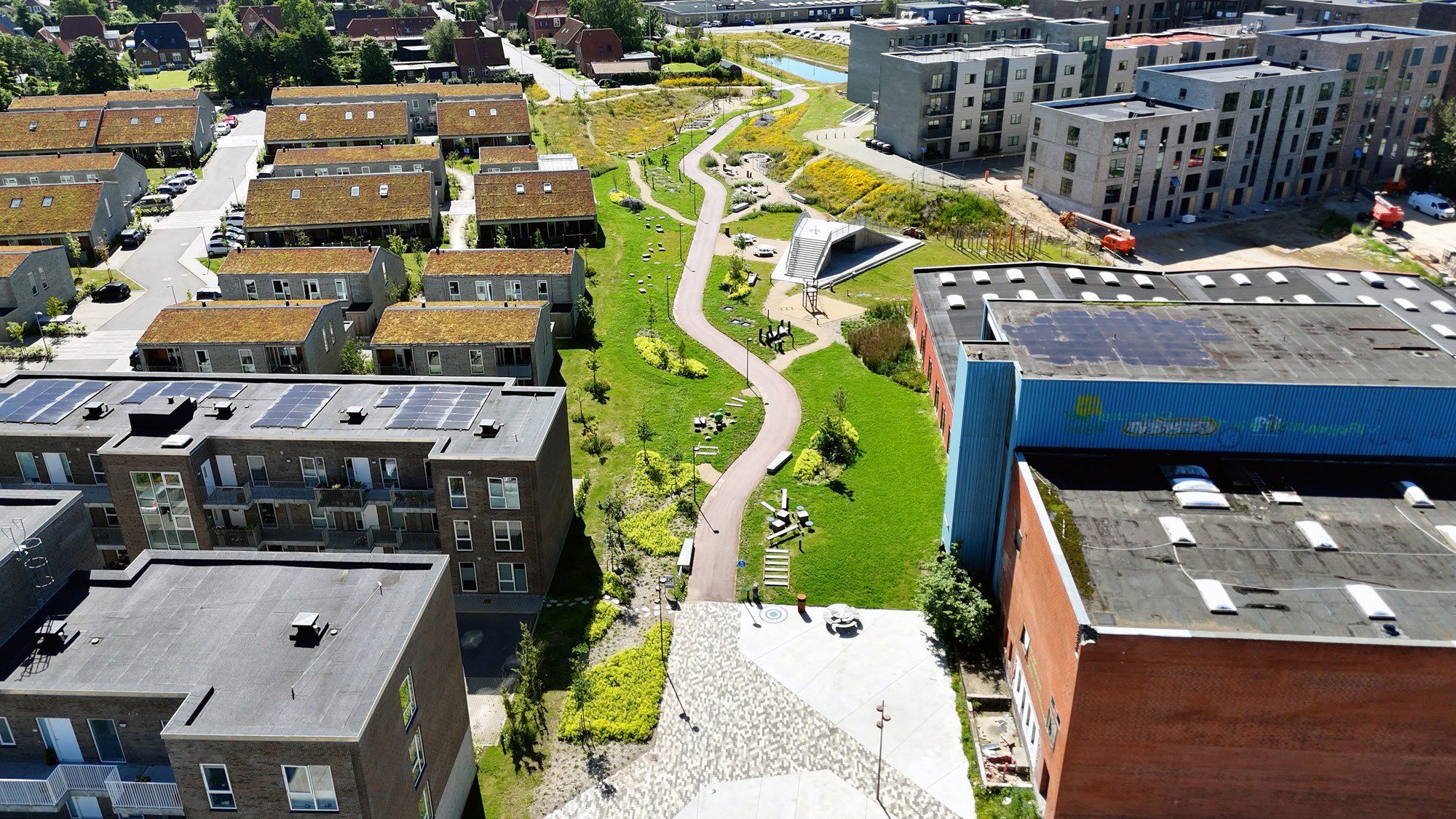 I parken er også en sø og et tørt bassin, der kan bruges til leg og aktiviteter, når der ikke er regnvand i det.
