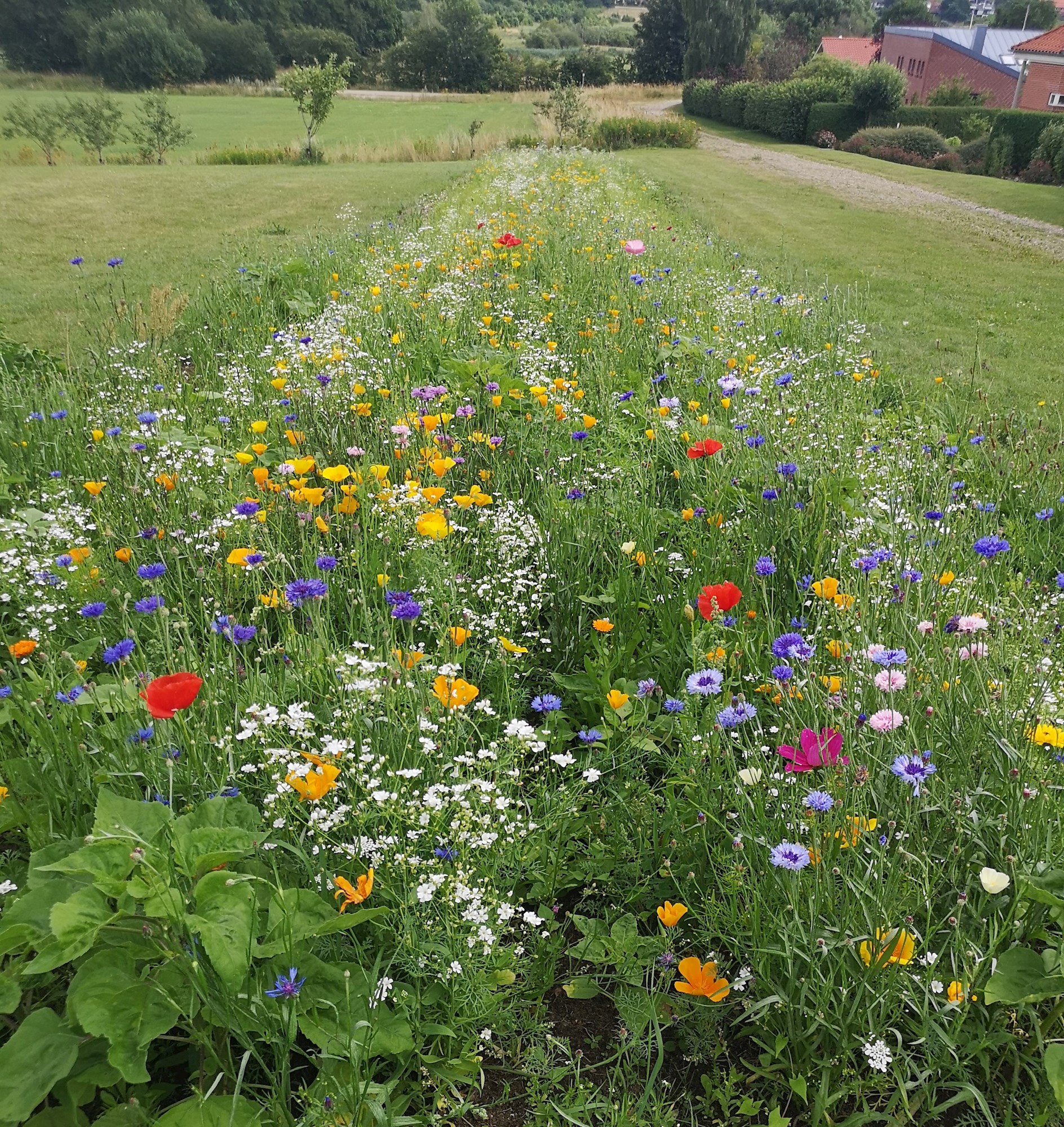 Vi giver blomsterfrøene - en vild blomstereng-blanding med mange forskellige hjemmehørende arter med både ét og flerårige urter. I skal selv betale entreprenøren for jordbearbejdningen og selve såningen.
