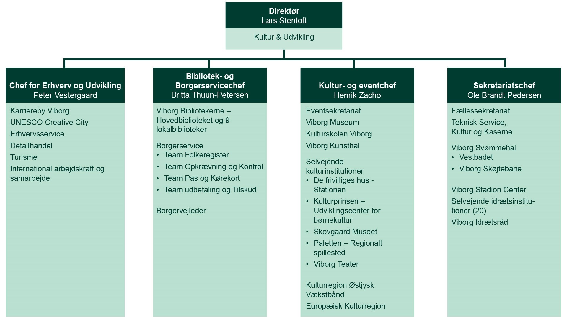 ForsideOm kommunenOrganisationKultur & UdviklingOrganisationKultur & UdviklingKultur & UdviklingDirektørområdet arbejder med erhverv og udvikling, bibliotek og borgerservice, kultur og idræt, foreninger samt landdistriktsudvikling.senest opdateret 13. januar 2025Organisering i Kultur & UdviklingPeter Aistrup VestergaardChef for Erhverv og Udvikling40 22 92 11pev@viborg.dkBritta Thuun-PetersenBiblioteks- og Borgerservicechef87 87 34 00brt@viborg.dkHenrik ZachoKultur- og eventchef87 87 32 00hza@viborg.dkOle Brandt PedersenSekretariatschef87 87 31 00obp@viborg.dk